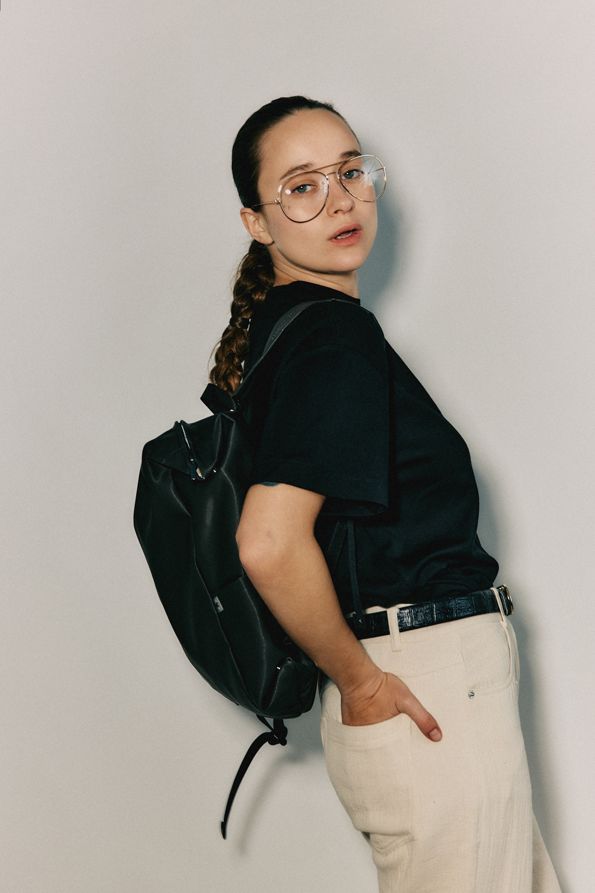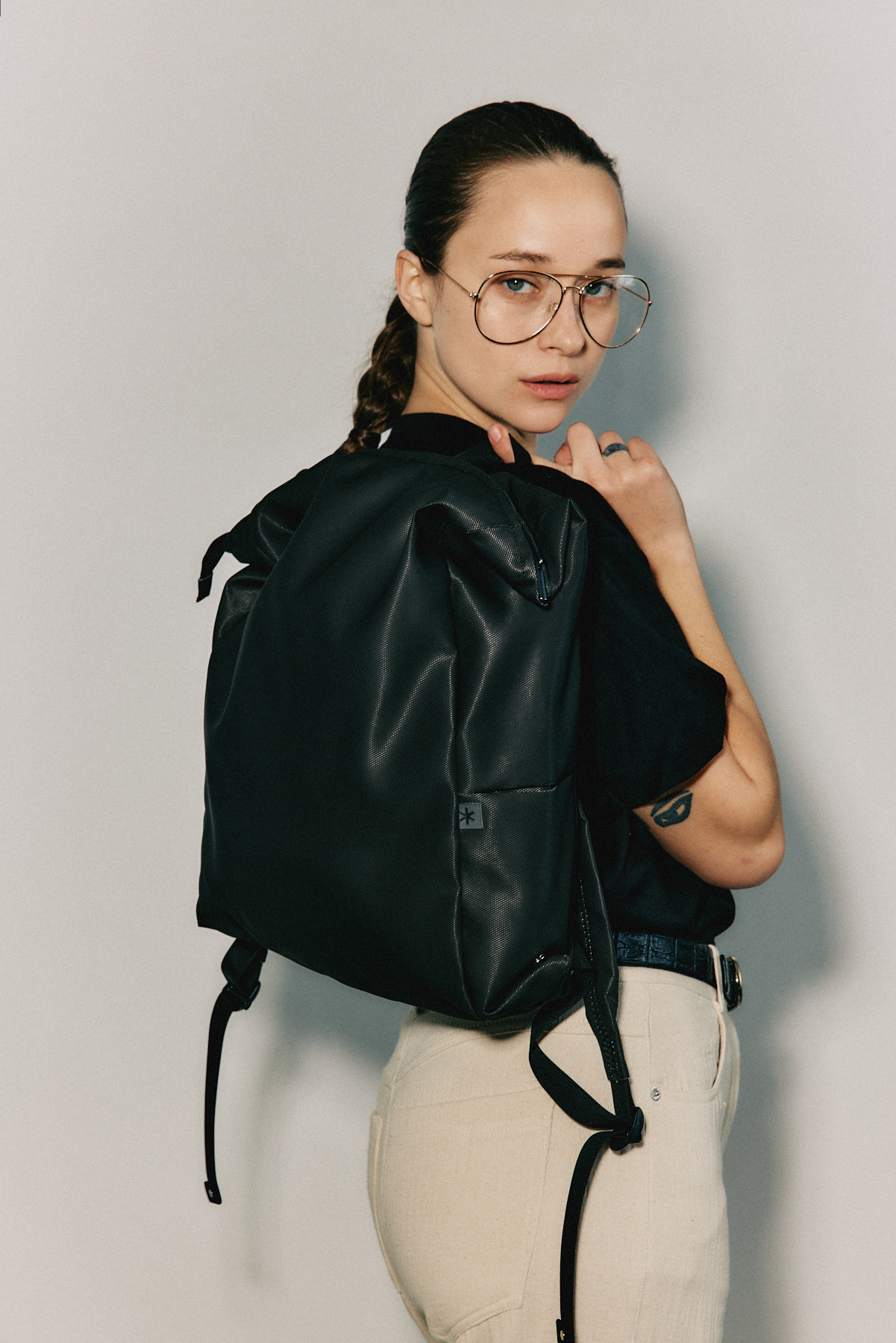 תיק גב במראה ספורטיבי, עשוי בד כותנה טבעית,  יכול לשנות את נפחו ממראה שטוח דו ממדי לתלת ממד באמצעות סדרת לחצניות, תיקתקים, למעלה ולמטה. תא גדול הנסגר באמצעות רוכסן ובו שני כיסים הנסגרים גם הם עם רוכסן, כיס לטלפון נייד ולשונית בד ובקצה אבזם למפתחות. בדפנות התיק שני כיסים נסתרים. לתיק שני מצבים: